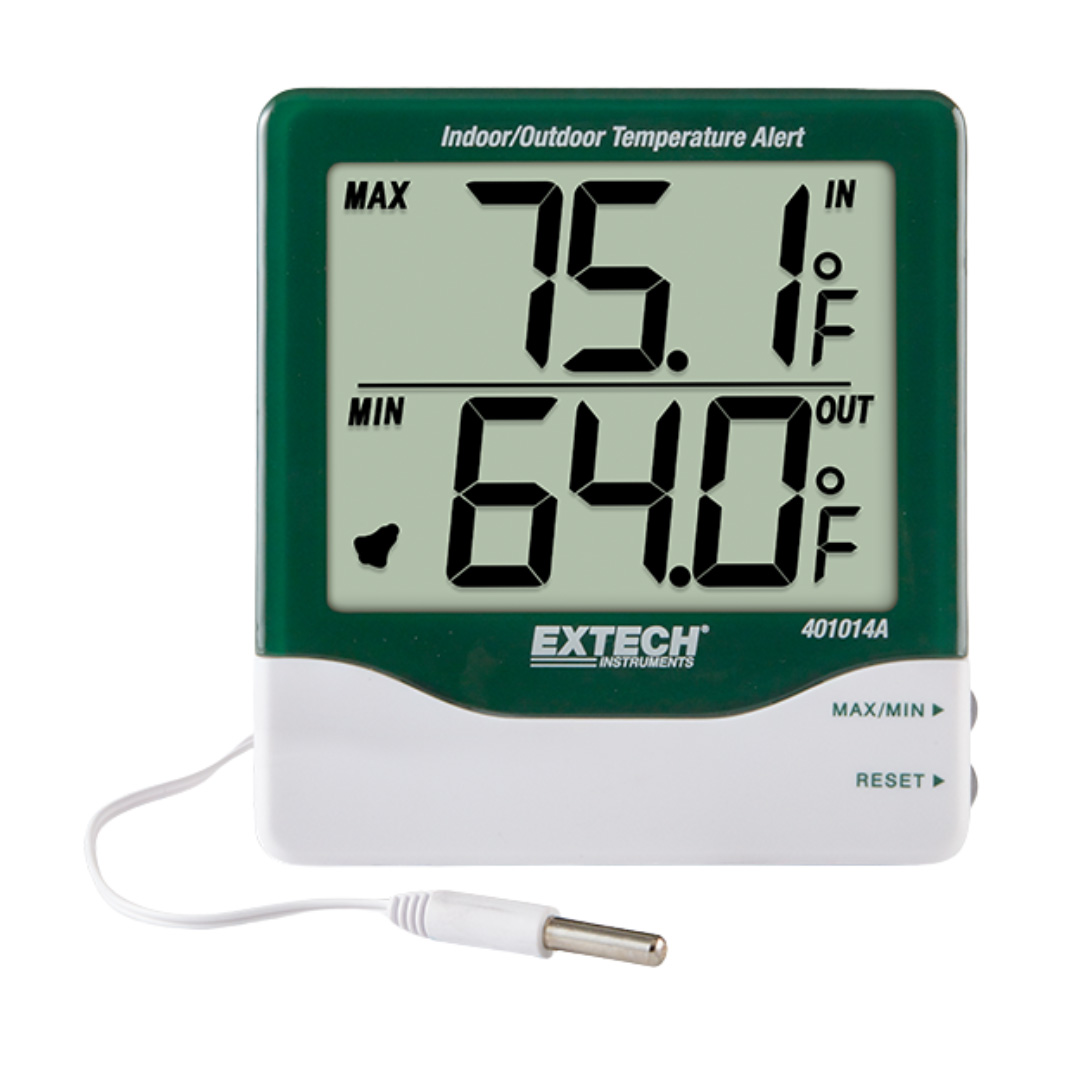 Higrotermómetro para interiores/exteriores de dígitos grandes. Muestra simultáneamente la temperatura y la humedad en interiores y exteriores. Mide la humedad desde el 10 % de HR hasta el 99 % de HR ± 5 % de HR, y la temperatura desde ?10 °C hasta 60 °C ± 1 °C (14 °F a 140 °F ± 1.8 °F). La función máx./mín. con restablecimiento almacena y recupera mediciones altas y bajas para los 4 parámetros. Incluye soporte incorporado, soporte de montaje en pared, sensor para exteriores con cable de 35 in (89 cm) y batería AAA de 1.5 V.