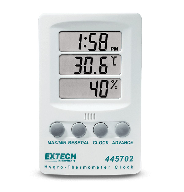 Reloj de higrotermómetro. COmbina 3 pantallas de hora, temperatura y humedad. El reloj muestra la hora en formato de 12 y 24 horas. Incluye un máximo/mínimo con función de reinicio. La humedad mide del 10 % de HR al 85% de HR ± 6 % de HR, y la temperatura mide de ?10 °C a 60 °C ± 1 °C (14 °F a 140 °F ± 1.8 °F). Incluye soporte de pie, soporte de montaje en pared y batería AAA.