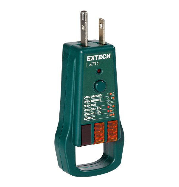 Probador de receptáculos con interruptor de circuito por falla a tierra (GFCI) para tomas eléctricas de tipo B. Prueba circuitos GFCI para detectar cableado defectuoso en receptáculos de 3 cables en circuitos de 110-125 V CA, 50/60 Hz. El ET11 verifica los receptáculos correctamente cableados y detecta varias fallas de cableado diferentes, entre ellas: conexión a tierra abierta, conexión neutra abierta, conexión viva abierta, conexión viva/tierra invertida y conexión viva/neutral invertida con luces que indican la condición del circuito. Con características convenientes como una barra de tiro ergonómica y una leyenda en ambos lados del dispositivo, el ET11 garantiza una inspección segura y confiable de los tomacorrientes en todo momento.