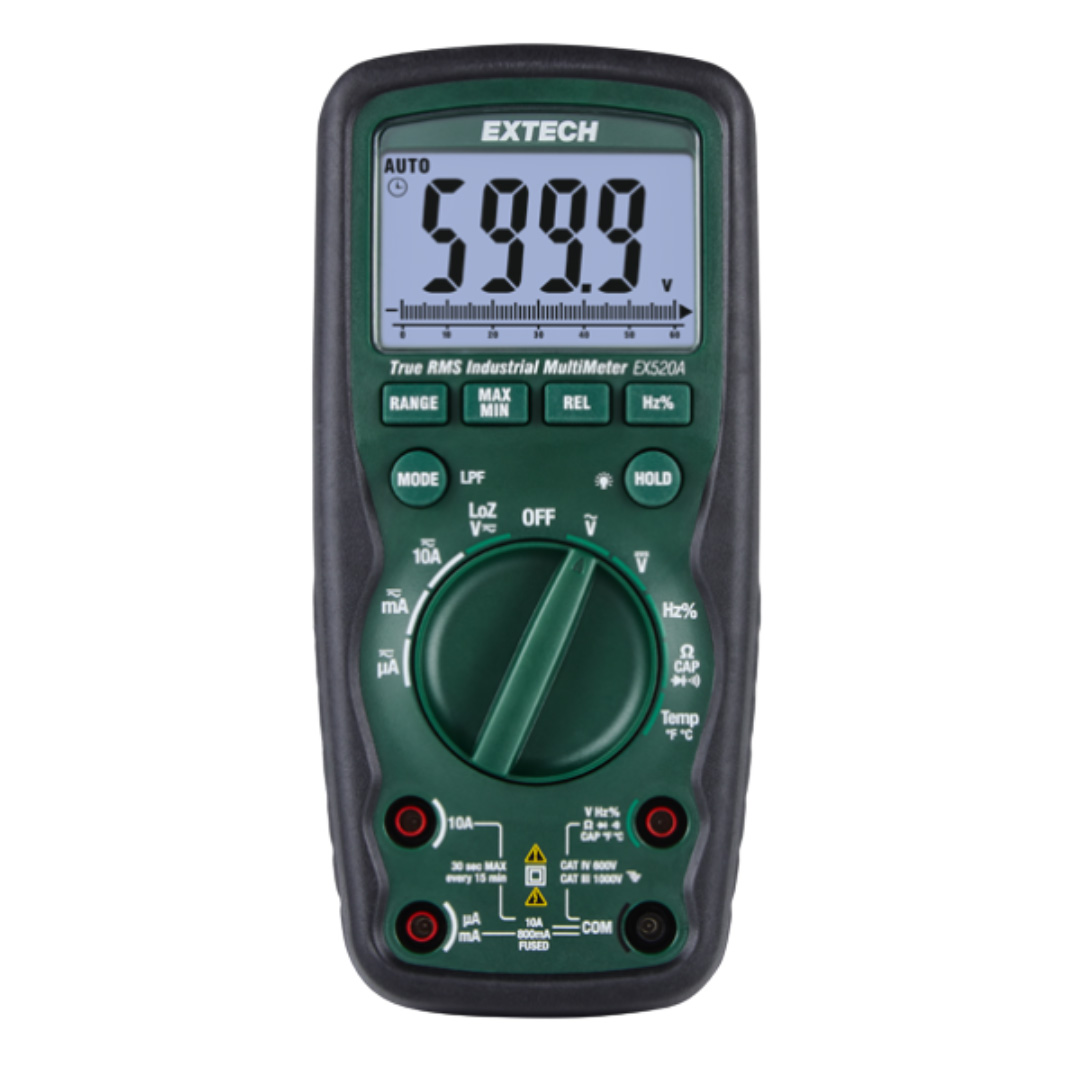Multímetro industrial de RMS verdadero de alta resistencia. Mide voltaje CA/CC, corriente, resistencia, capacitancia, frecuencia de sensibilidad doble (eléctrica de 1 kHz/electrónica de 10 MHz), termopar tipo K de -45 °C a 760 °C (de -50 °F a 1400 °F) y sonda de temperatura de alambre reforzado de -20 °C a 250 °C (de -4 °F a 482 °F). Cuenta con una pantalla LCD retroiluminada de 6000 cuentas, precisión básica del 0,09 %, retención de datos/relativa y una función de encendido automático. Con una clasificación de seguridad CAT IV-600 V y una clasificación IP67 para resistencia al agua y el polvo, el EX520A es una herramienta ideal para electricistas, técnicos de HVAC y técnicos de instrumentos de medición compactos que requieren precisión, durabilidad y seguridad en sus equipos de pruebas eléctricas.